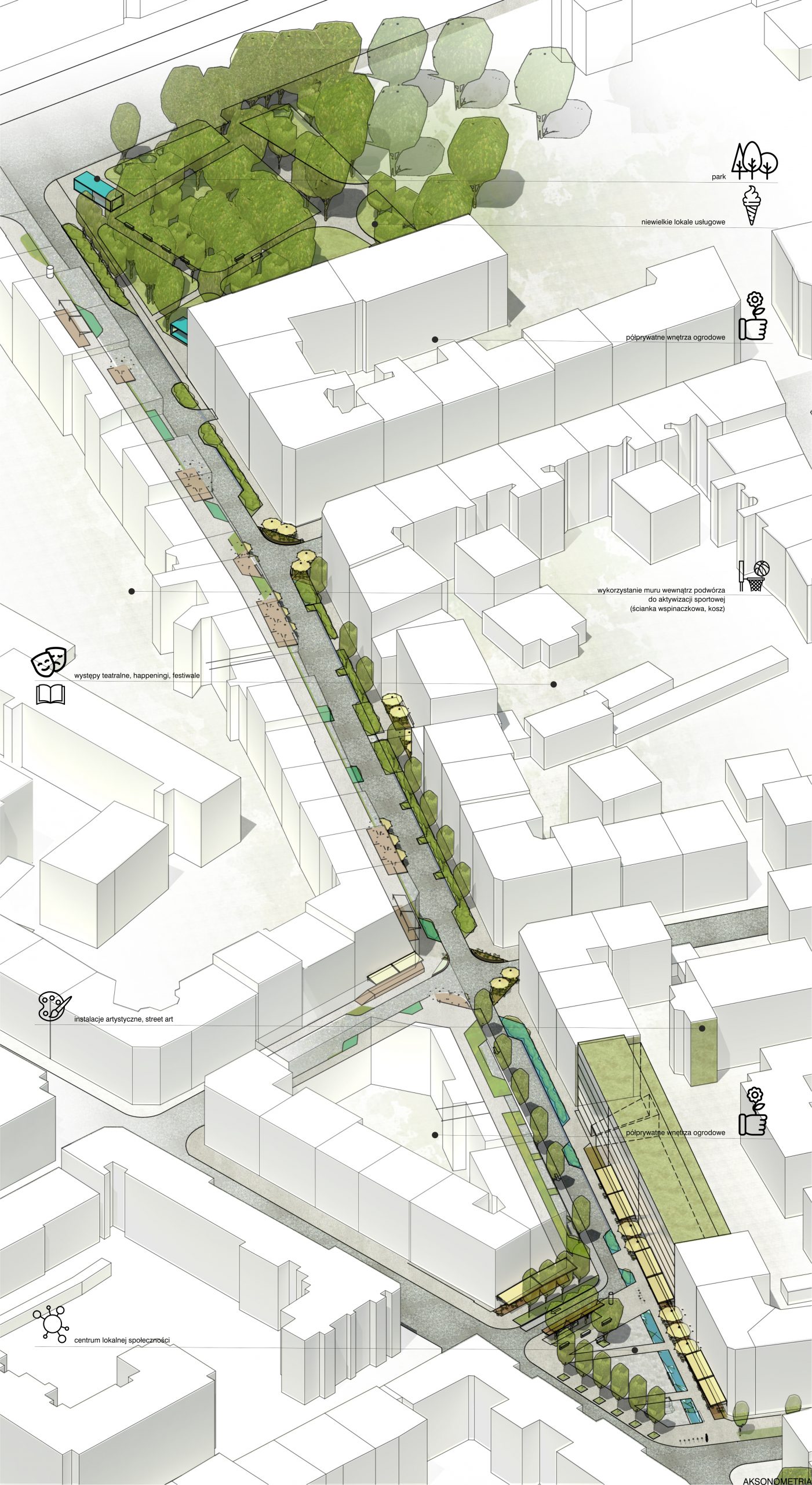 Głównym założeniem urbanistycznym jest uzupełnienie tworzywa wyznaczającego wnętrze ulicy i powiązanie funkcji znajdujących się na jej końcach oraz przywrócenie ładu przestrzennego, w prostym historycznie wyznaczonym układzie przestrzennym.