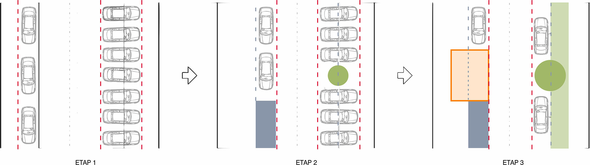 - wyznaczenie placu trójkątnego ścianami (szpalery, pierzeje), zamknięcie dla ruchu kołowego;