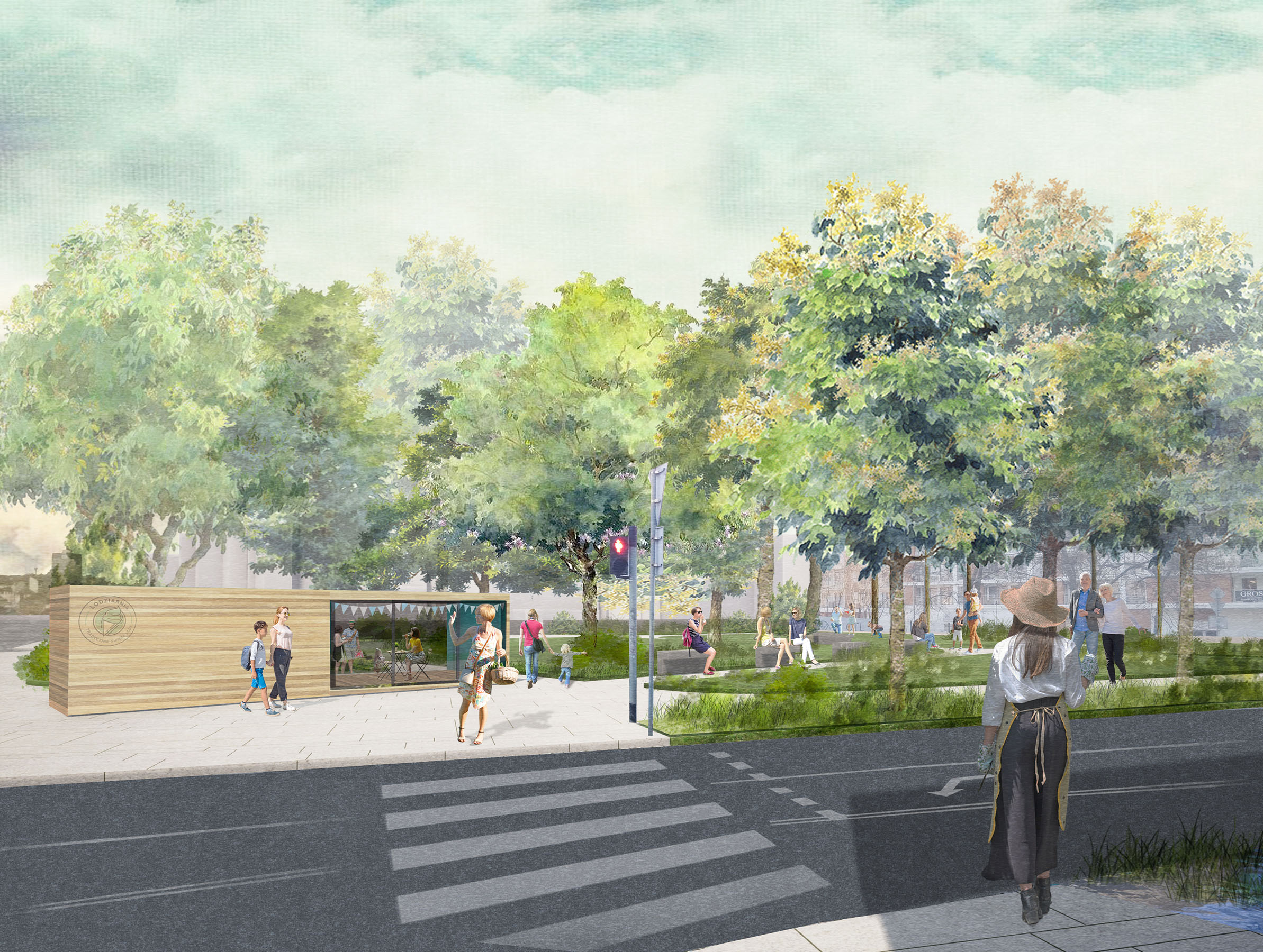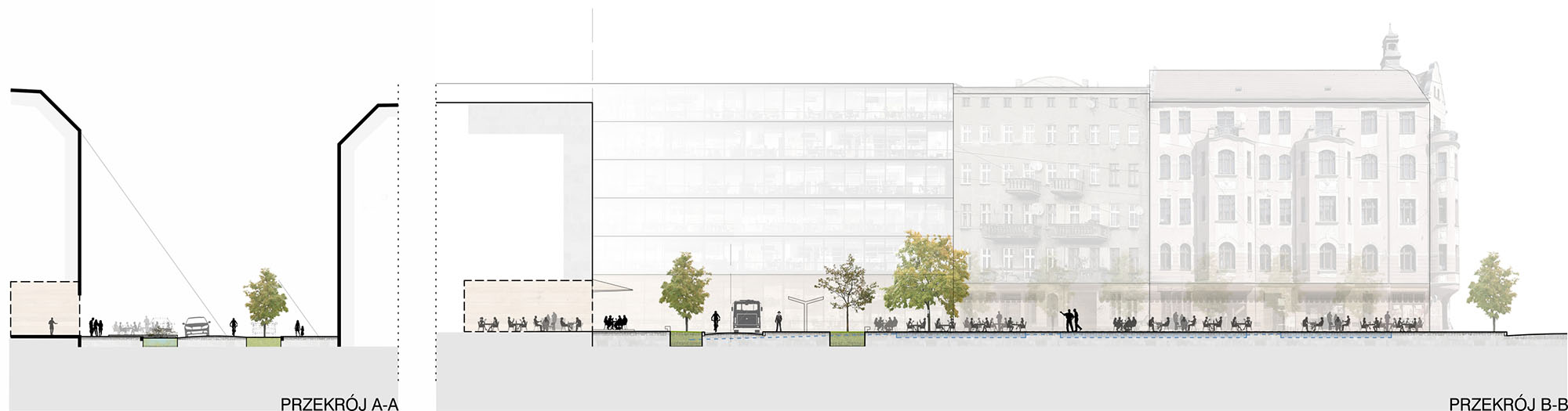 Koncepcja opracowana w ramach konkursu studialnego, urbanistyczno-architektonicznego na zagospodarowanie fragmentu ulicy Komuny Paryskiej wraz z przestrzeniami publicznymi na styku ulic Kościuszki (plac trójkątny) i Pułaskiego we Wrocławiu.