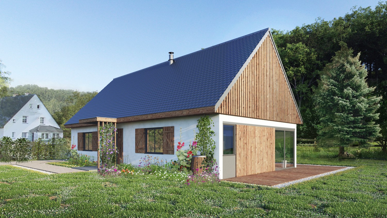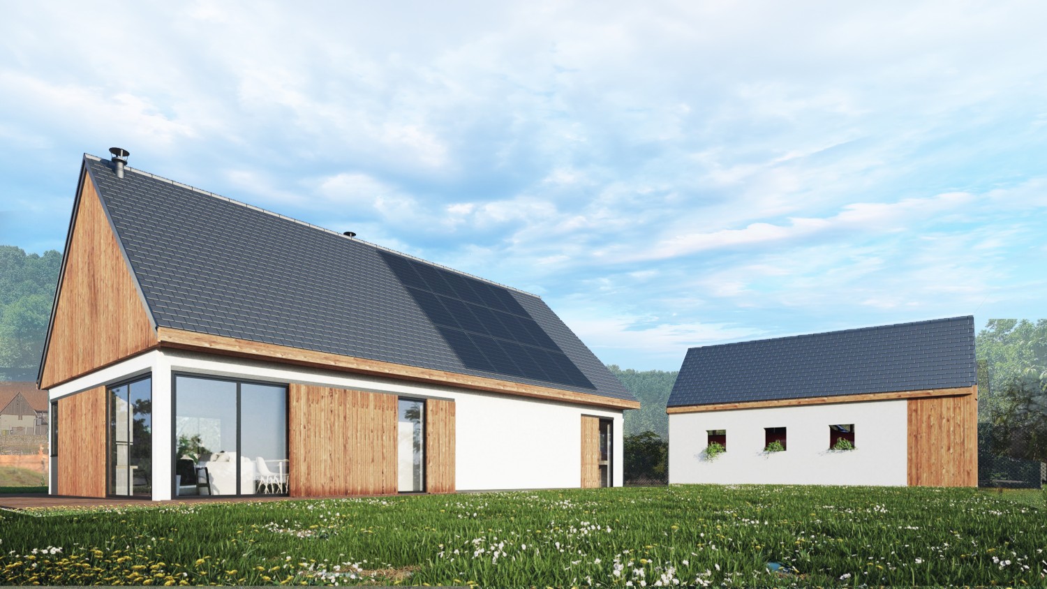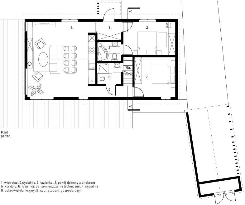 Często spotykany we wsi zagrodowy układ budynków, został odtworzony poprzez dodanie wiaty gospodarczej, jako dopełnienia budynku mieszkalnego. Uzyskane w ten sposób wnętrze, w którego centrum znajduje się częściowo osłonięty taras, nadaje przestrzeni za domem charakter podwórza i daje poczucie większej intymności.
