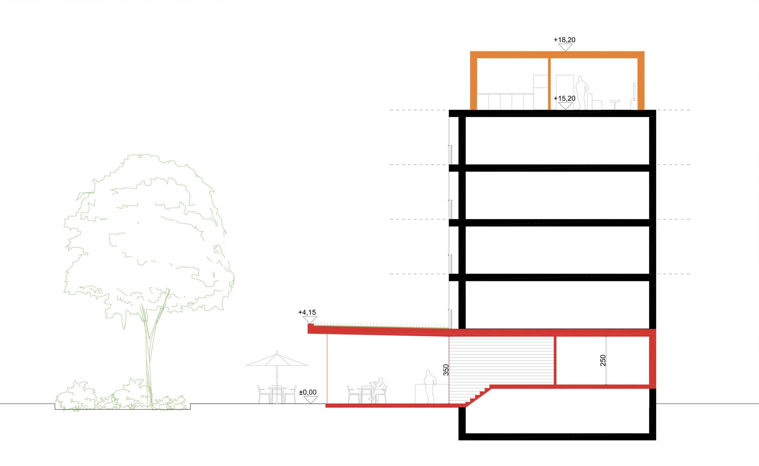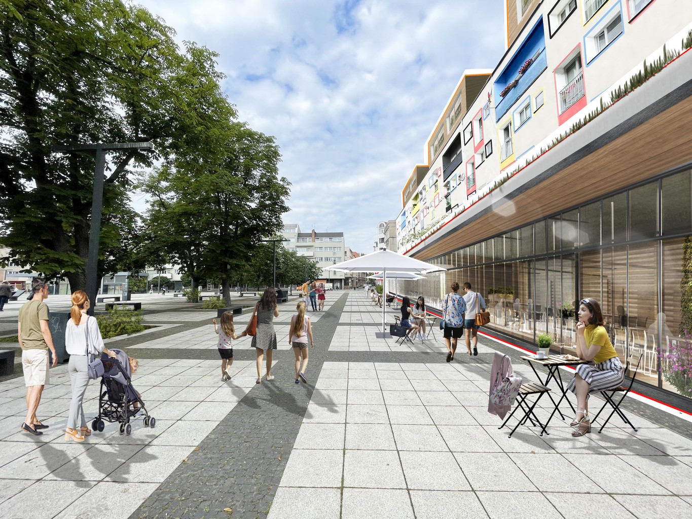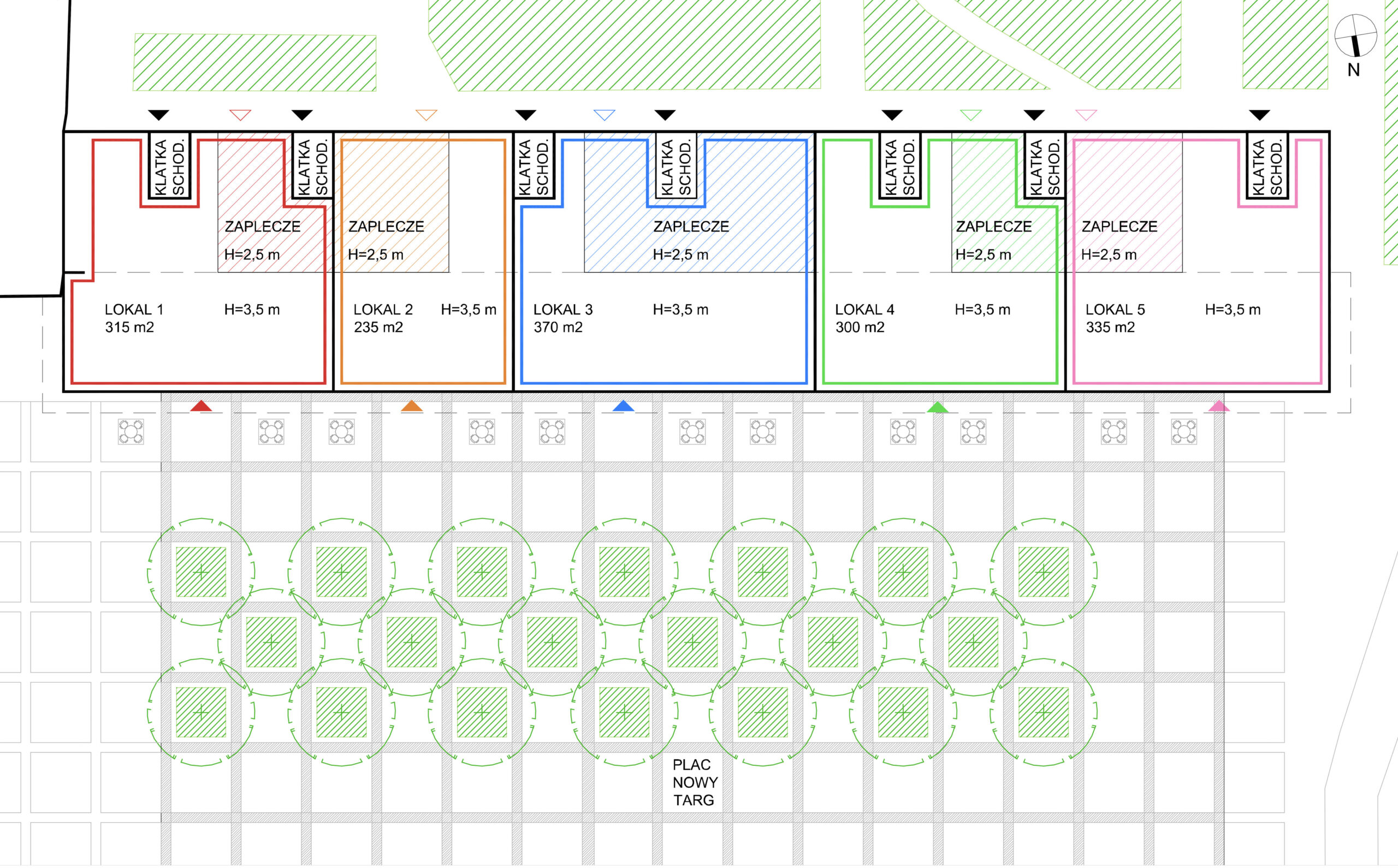 Założeniem jest porozumienie ze Spółdzielnią/Wspólnotą i właścicielami mieszkań w parterze i rozbudowa parterów – dobudowa pawilonu usługowego oraz zagospodarowania części terenu na placu Nowy Targ. Projektowany budynek to przeszklony parterowy pawilon, otwarty na plac, dobudowany jest do istniejącego budynku mieszkalnego – w formie płaskiego zielnego dachu na słupach osłoniętego szklanymi ścianami kurtynowymi. Dzięki temu architektura pawilonu dyskretnie wtapia się w modernistyczne otoczenie otwierając się na plac, pokazując życie w parterach usług a także odbijając w przeszkleniach sąsiadująca zieleń.