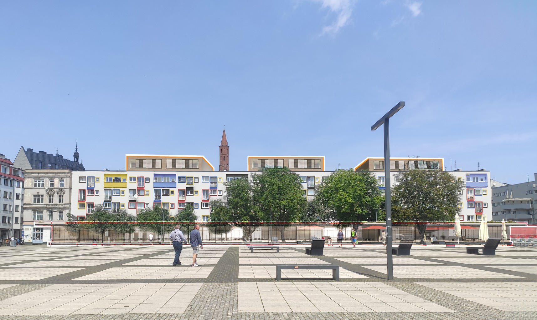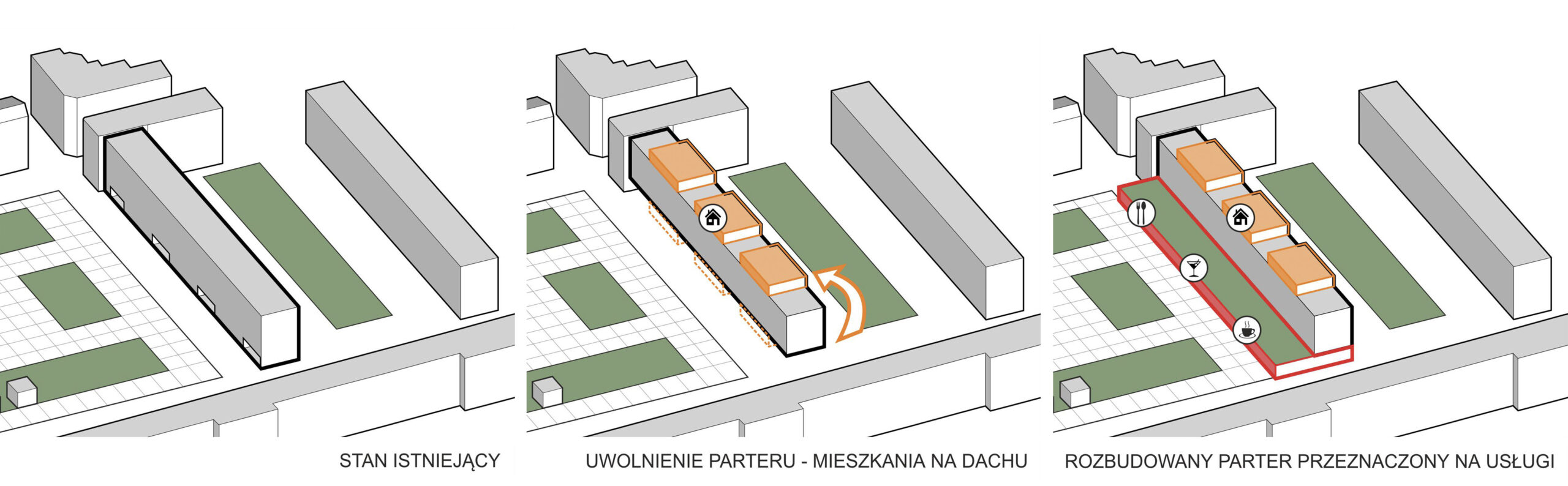 Pomysł opiera się na przeniesieniu powierzchni mieszkalnych z parteru na dach i odzyskaniu powierzchni dla usług, z rozbudową parterów. To pozwoli na wprowadzenie życia w obrębie jednego z trzech najważniejszych placów Starego Miasta i zaproponowanie nowej jakości przestrzeni publicznej w bardziej współczesnej formie, spójnie z prowadzoną rewitalizacją samego placu.