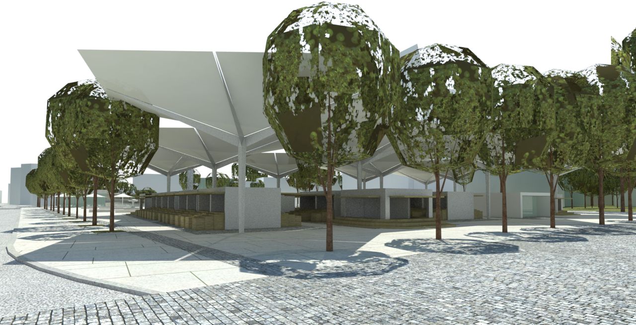 W północnej części placu projektuje się zadaszenie w nowoczesnej formie, skomponowane z 11 „odwróconych parasoli”. Teren pod zadaszeniem zagospodarowany jako targ – miejsce handlu i życia społecznego w dzień, a wieczorem efektownie podświetlona forma stanowiąca wystrój placu.